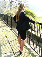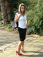 Sexy blonde looks fantastic in her red high heels and shiny pantyhose outdoors